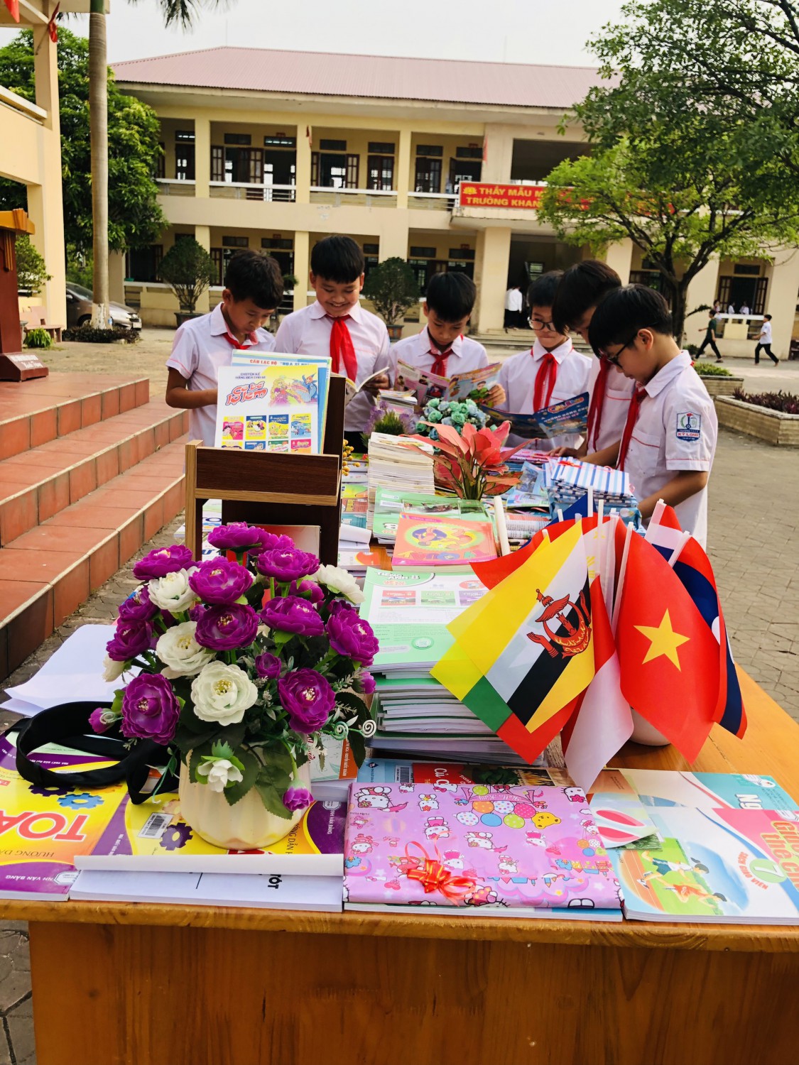 Các bạn học sinh rất thích thú với gian hàng sách mà Thư viện nhà trường đã chuẩn bị.